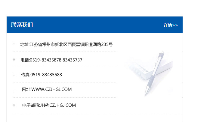 地址:常州市新北區友邦商務大廈1幢16、17層  電話:0519-85101652  傳真:0519-85112595  郵編:213022  網址:www.cz-jiayue_cn.gzzslt.com  郵箱:xiajifengaa@163.com